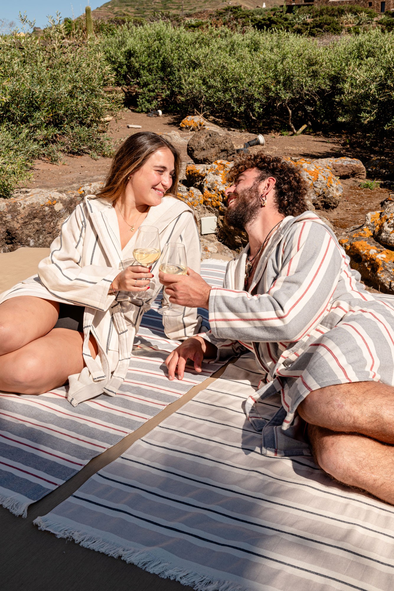 Elegante e versatile, questo accappatoio si distingue per il suo design moderno e minimalista. Le tonalità neutre creano un look raffinato e senza tempo, perfetto da indossare in spiaggia, in piscina o dopo una doccia rigenerante.