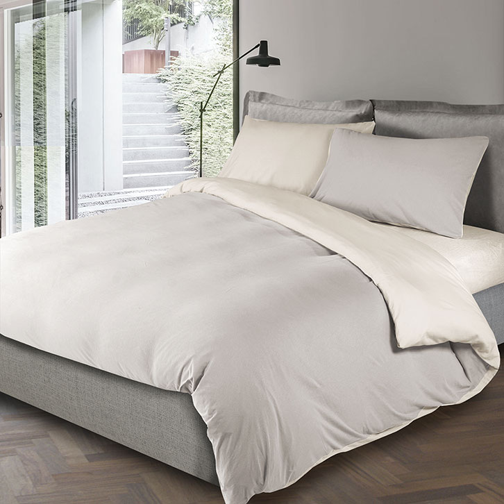 Con il completo copripiumino bicolore Logan, ogni notte diventa un viaggio di comfort e stile. Realizzato in 100% jersey di cotone, questo tessuto straordinariamente morbido e caldo accoglie il tuo riposo con una carezza. La sua trama avvolgente è perfetta per le stagioni più fredde, regalando una sensazione di benessere che si rinnova notte dopo notte.
