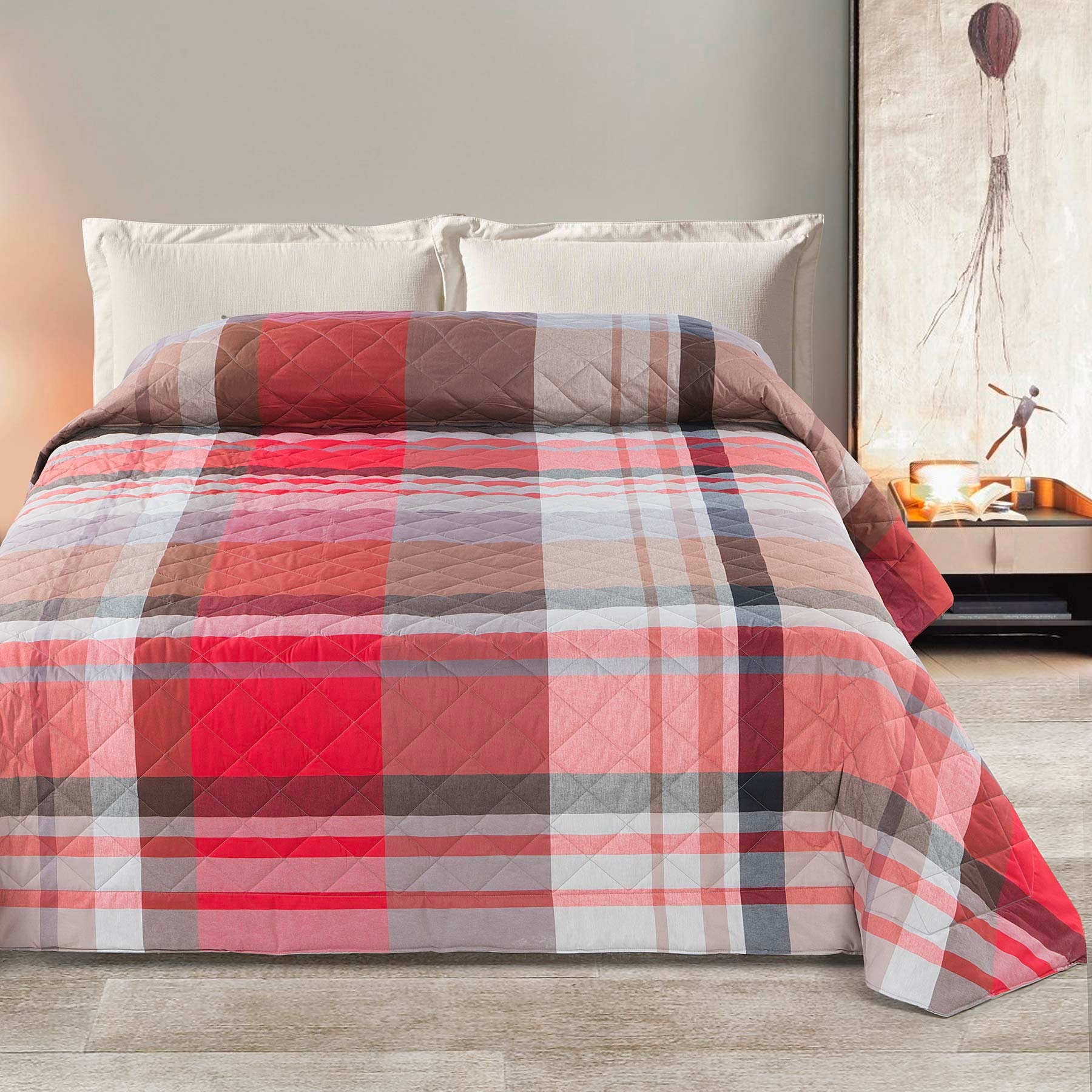 Con le sue dimensioni 270x260 cm, veste con classe e precisione ogni letto matrimoniale, offrendo fantasie di quadri moderni disponibili in varianti uniche e raffinate.